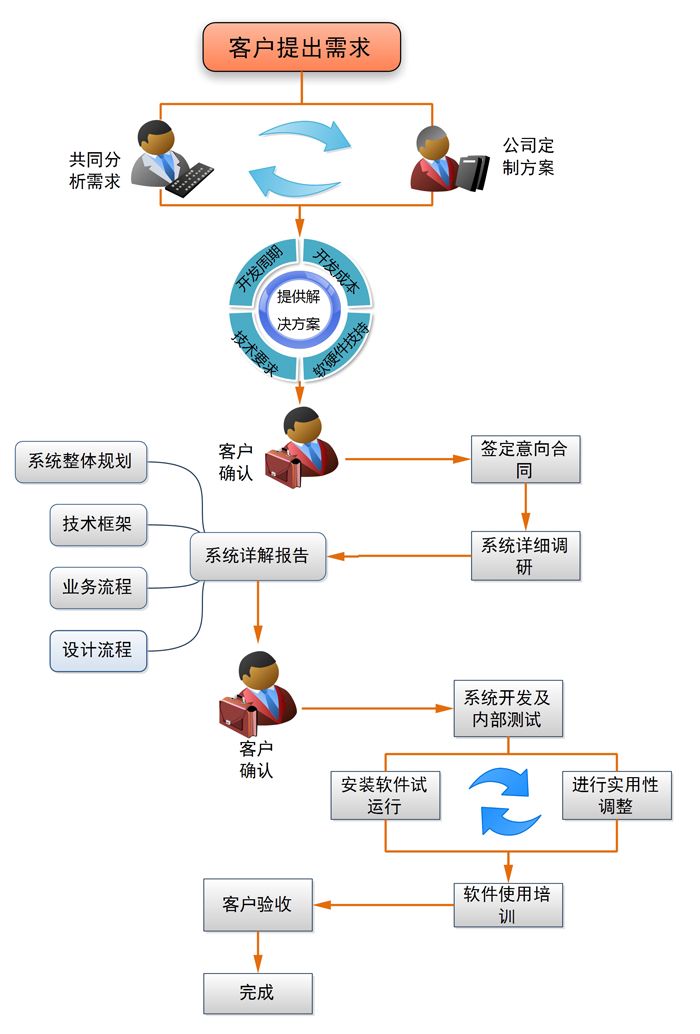 開 發(fā)過程將經(jīng)歷獲取需求、需求分析、系統(tǒng)結(jié)構(gòu)建立、軟件設(shè)計(jì)、代碼編寫、軟件測試等階段。 當(dāng)軟件的后期測試完成后,通知業(yè)務(wù)需求人員驗(yàn)收,驗(yàn)收主要以業(yè)務(wù) 需求人員提供的原始資料及《軟件定制開發(fā)需求書》為依據(jù),對軟件的各項(xiàng)功能進(jìn)行全面的核查, 如無異議,驗(yàn)收后簽署“驗(yàn)收確認(rèn)書”。項(xiàng)目組有義務(wù)對用戶提 供及時(shí)、有效、全面的培訓(xùn),并在項(xiàng)目實(shí)施過程中分重視對用戶方的技術(shù)轉(zhuǎn)移,并提前制訂有效可行的培訓(xùn)計(jì)劃。